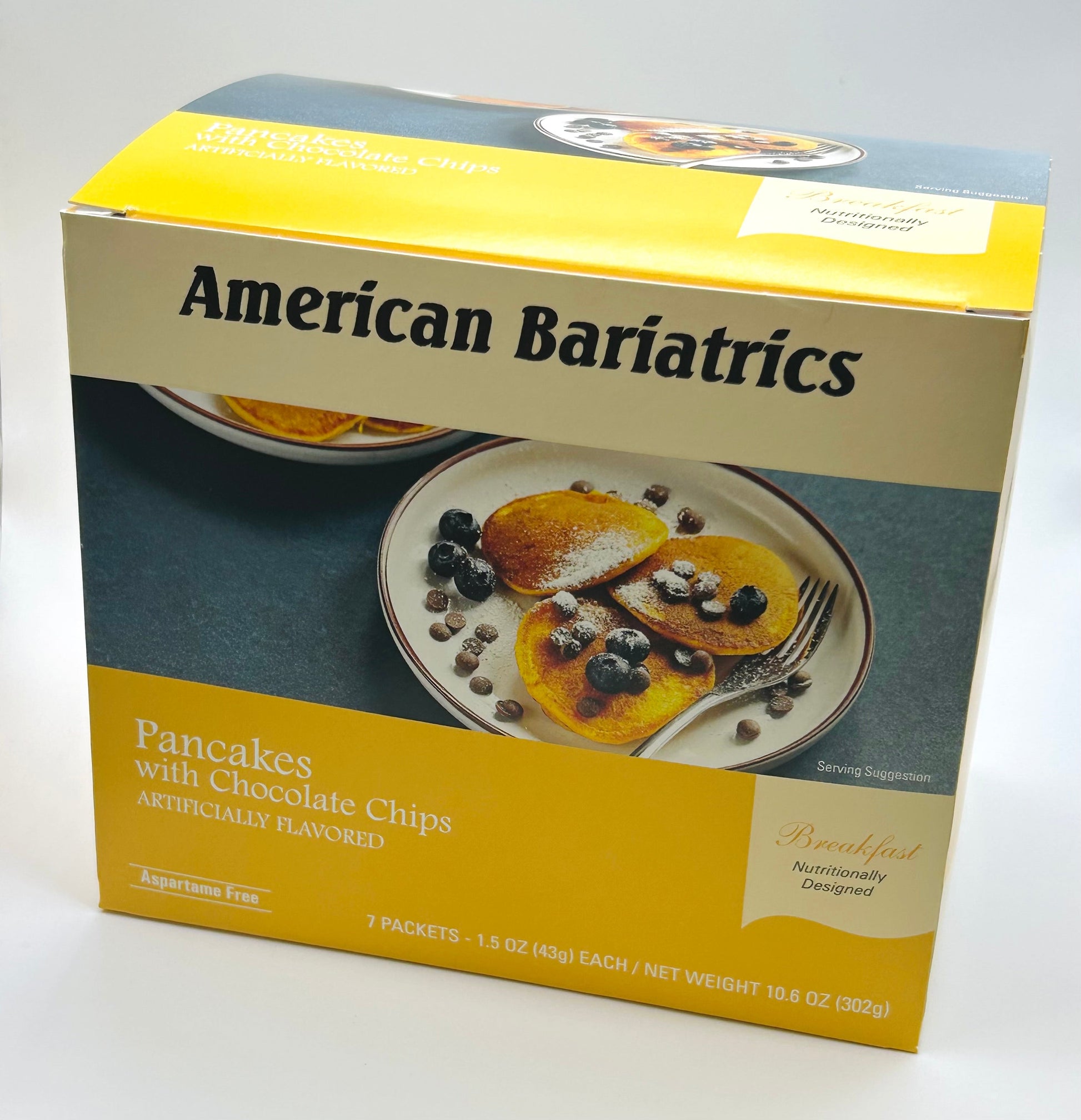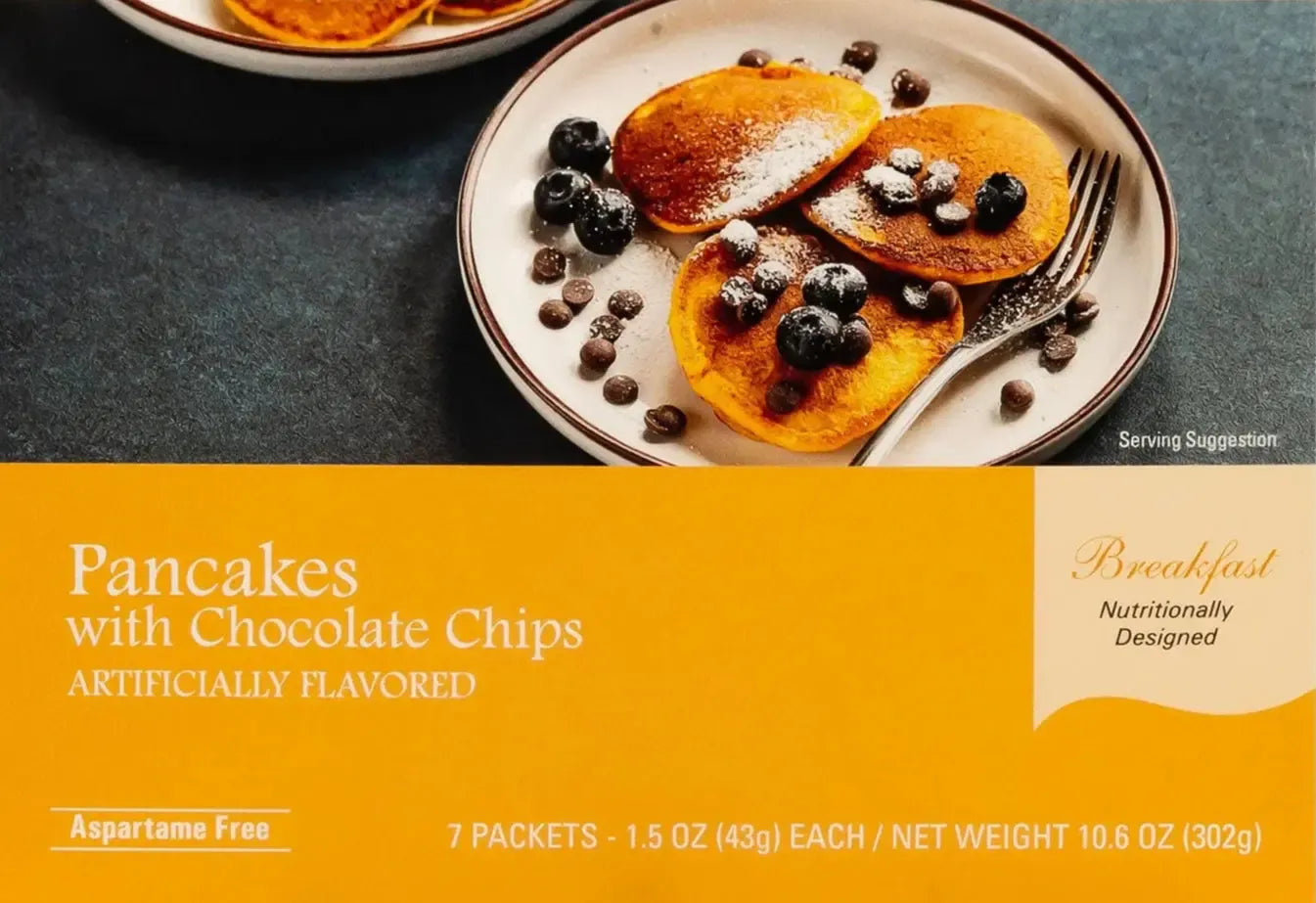 Start your day with a delicious protein-packed, diabetic and bariatric-friendly breakfast. These fluffy pancakes come with sweet chocolate chips but also only 3g sugar, plus they have 5g fiber. Perfect nutrition for breakfast!