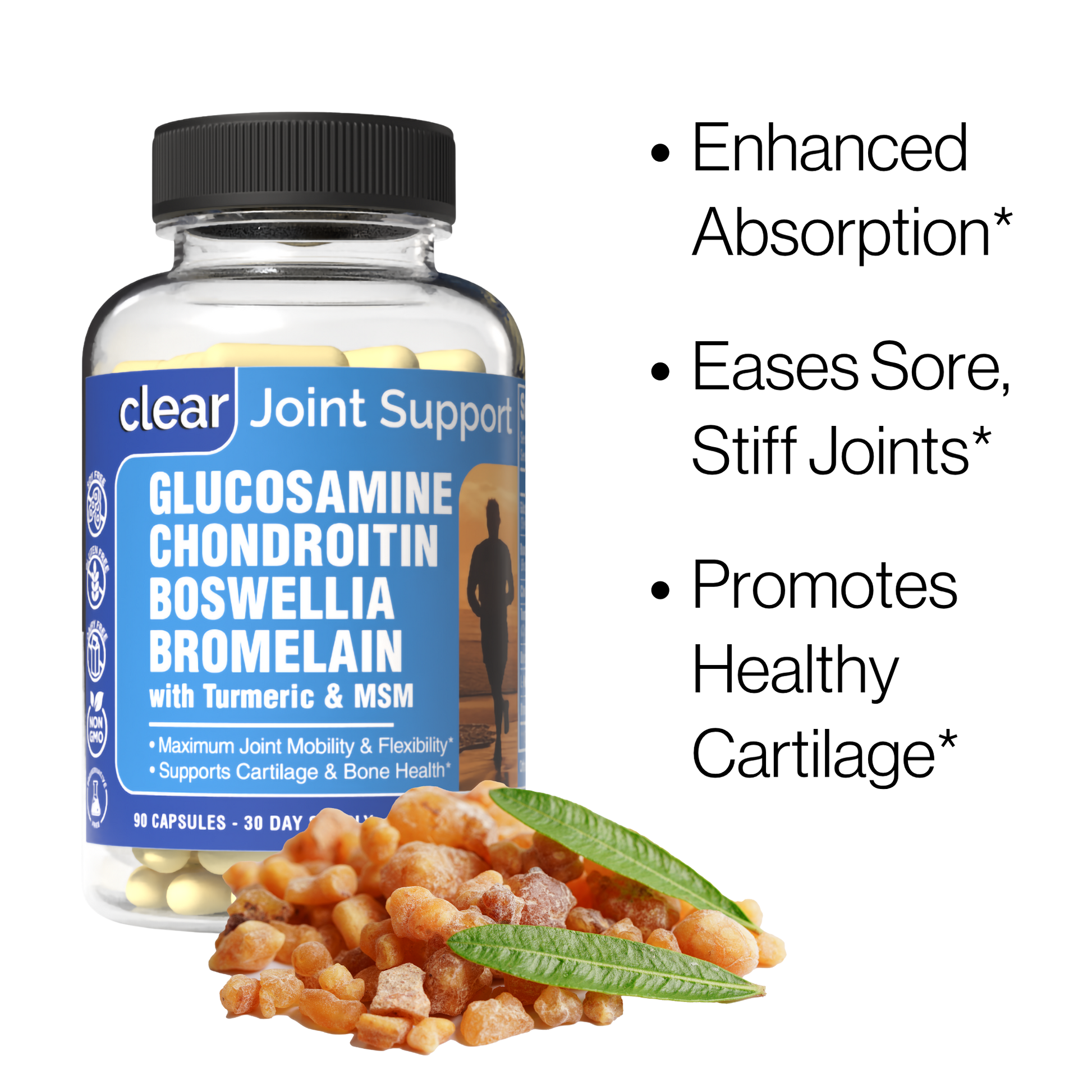 Clear Joint Support’s formula goes beyond basic Chondroitin & Glucosamine nutritional supplements by including powerful plant-based and antioxidant ingredients like Turmeric, Boswellia, Quercetin, and Methionine. These nutrients work together to reduce inflammation, soothe joint discomfort, and support faster recovery after activity, making it ideal for active lifestyles and daily relief.