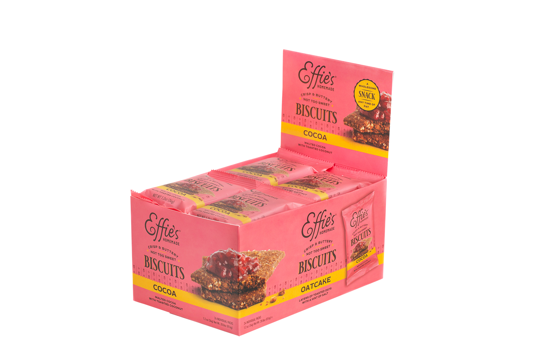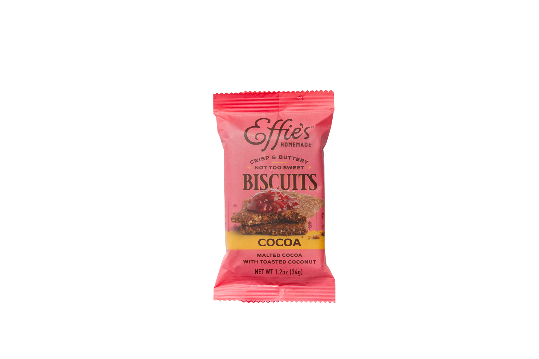 Crisp, buttery, and oh so chocolatey, Effie’s Homemade Cocoa Biscuits bring a bold, satisfying twist to traditional tea biscuits—all in a convenient, single-serve pack. These biscuits are made for snacking any time of day: try them with a creamy nut butter, fresh berries, or a scoop of your favorite ice cream. They're also a perfect match for your afternoon espresso or a glass of cold milk.