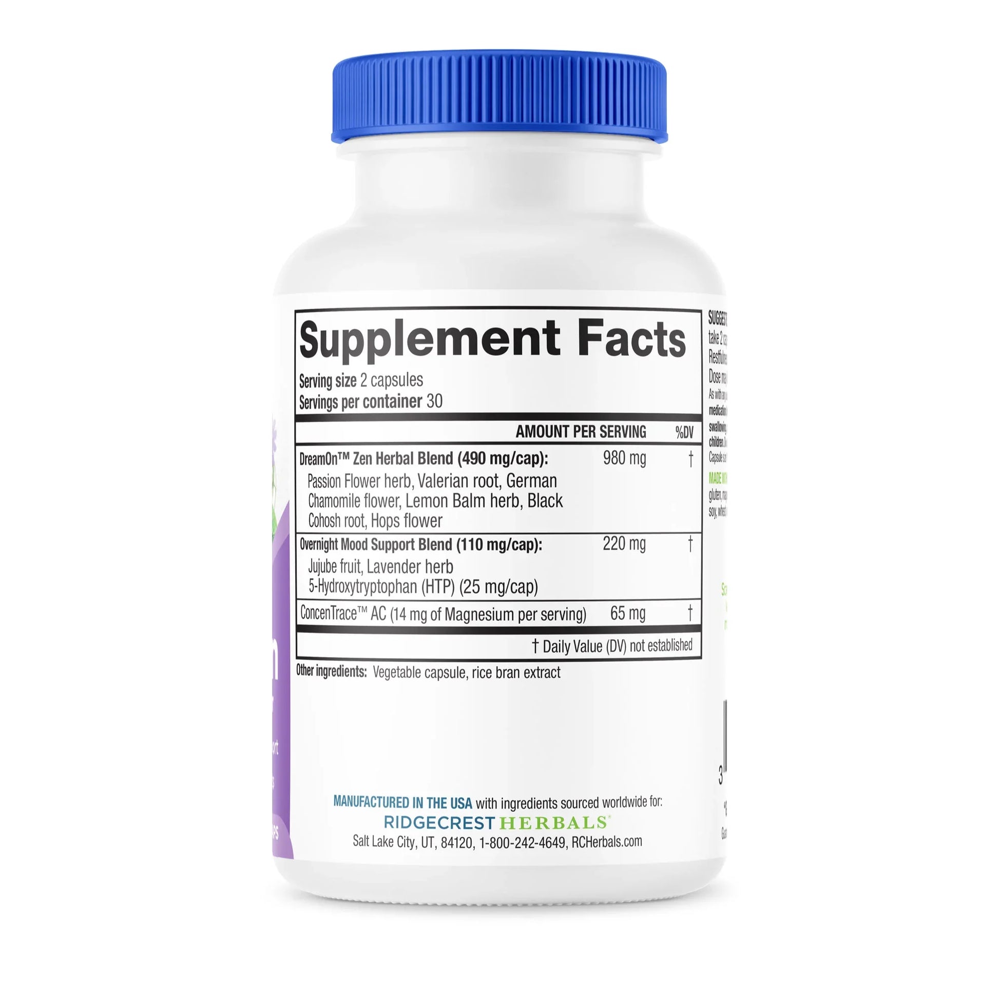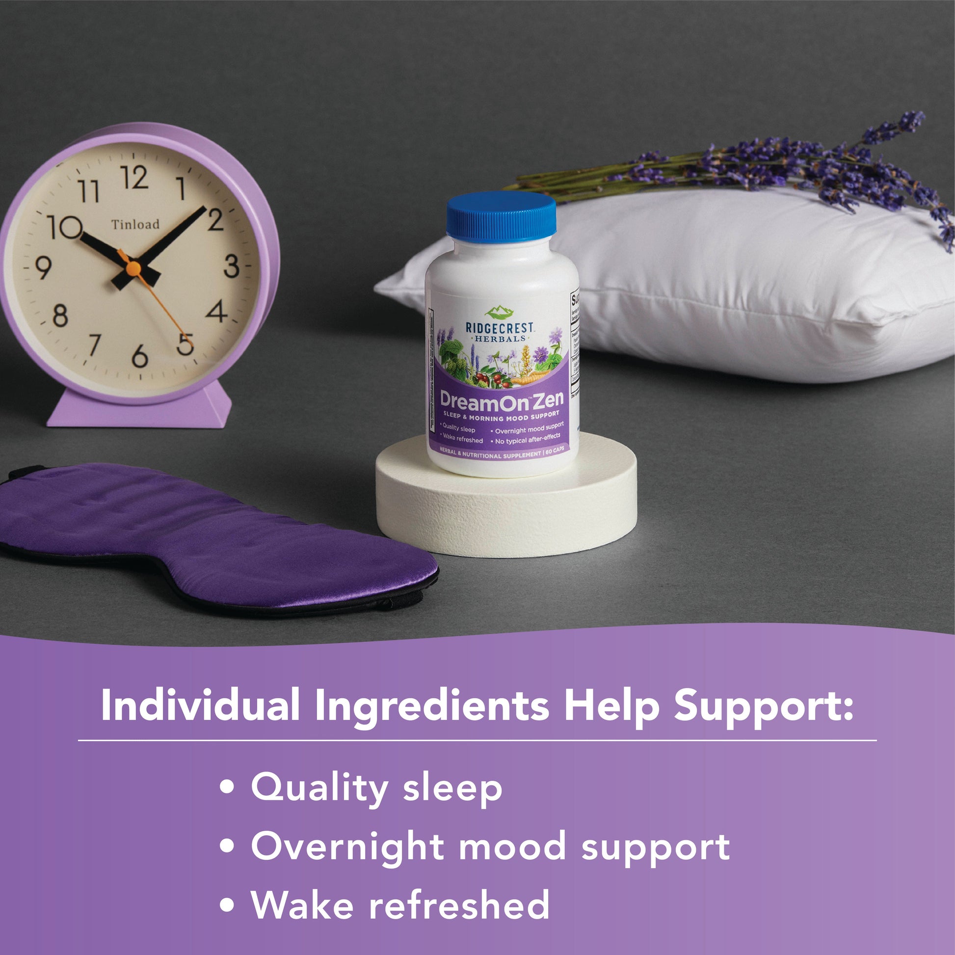 DreamOn™ Zen is a melatonin-free, natural sleep aid that supports a happy next-morning mood. Ingredients like Chamomile, Passionflower, Valerian, Lavender, Magnesium, and 5-HTP support a healthy circadian rhythm and promote restorative sleep so you wake up the next morning feeling alert and rested.