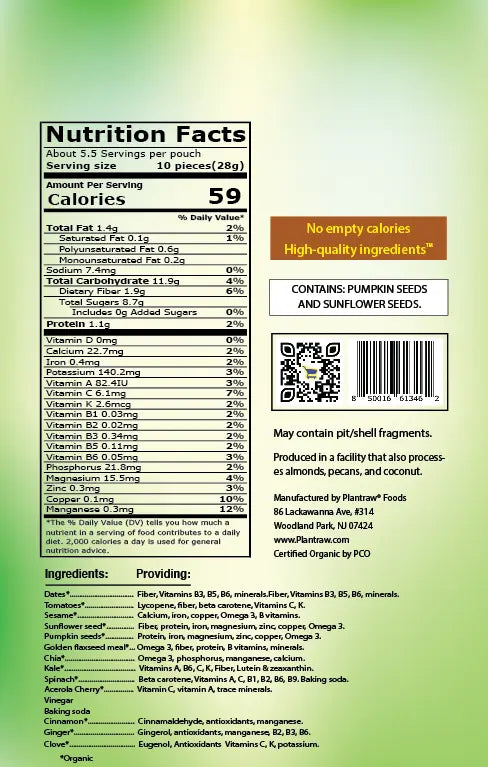 Ingredients: Dates, tomatoes, sunflower seeds, pumpkin seeds, golden flaxseed meal, chia, whole brown flaxseed, kale, spinach, acerola cherry, baking soda, cinnamon, ginger, clove.