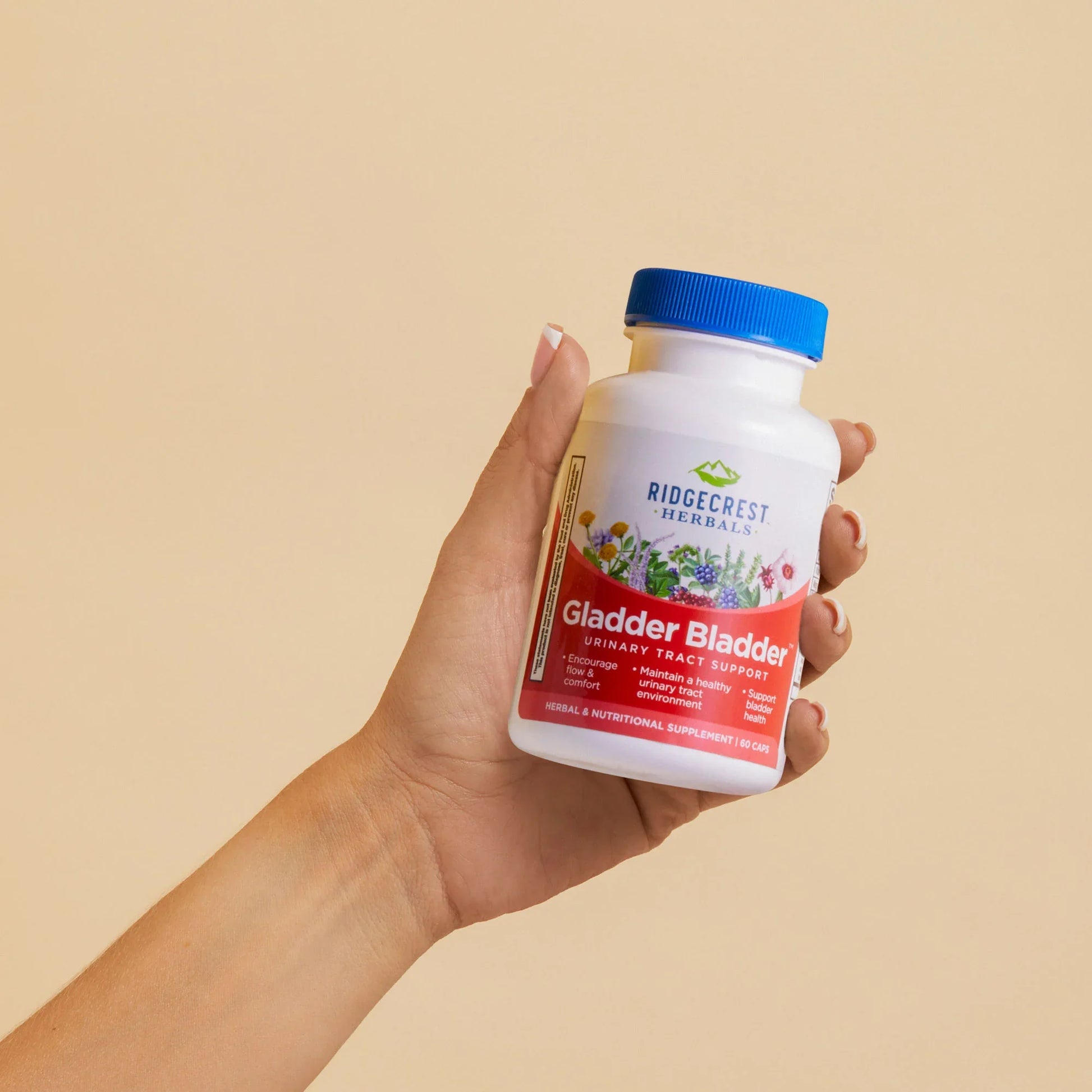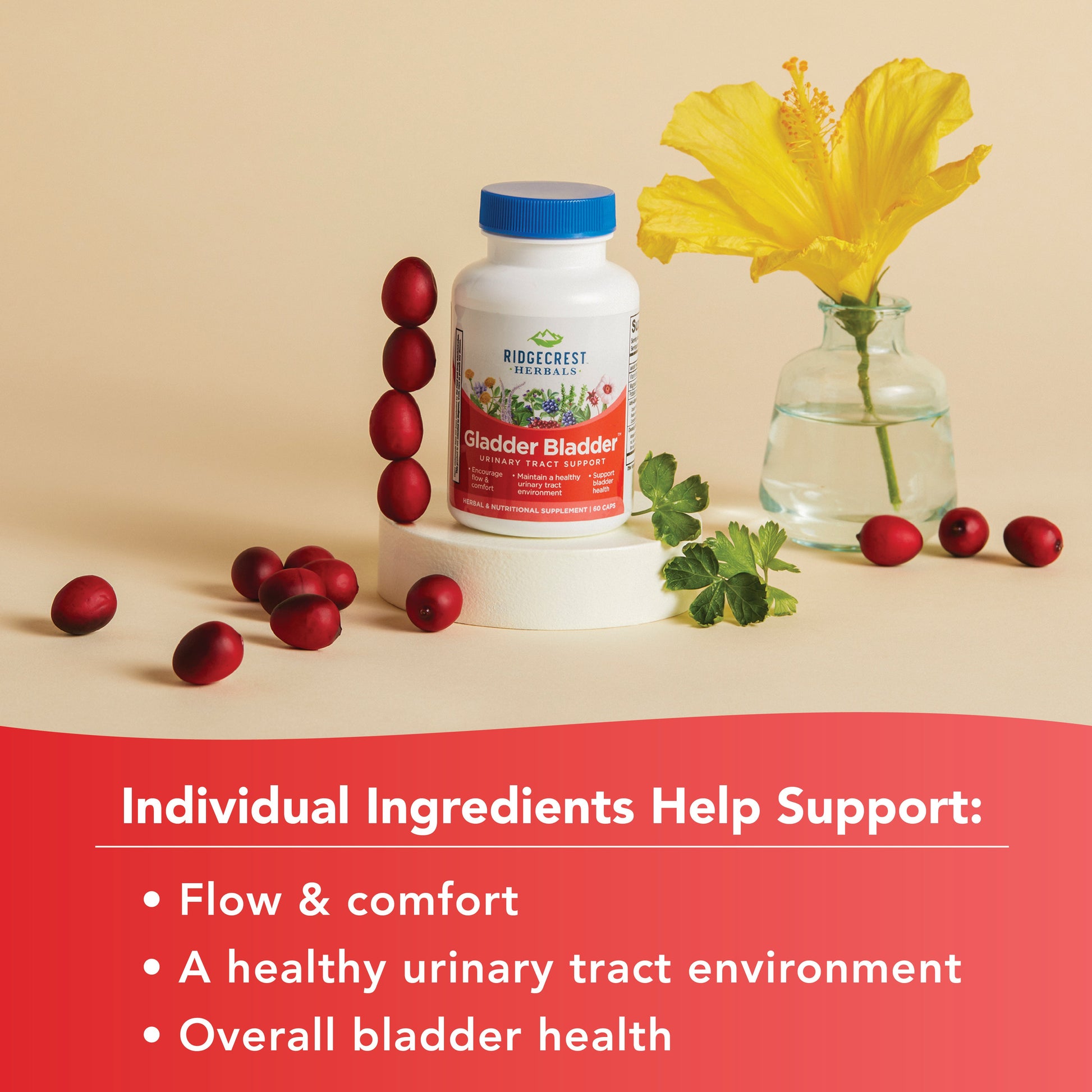Gladder Bladder™ supports normal urinary system function with a blend of nutrients like Hibiscus, Cranberry (PACran®), Dandelion root, and Juniper. This formula supports healthy bladder and urinary tract function, helping maintain a Gladder Bladder.
