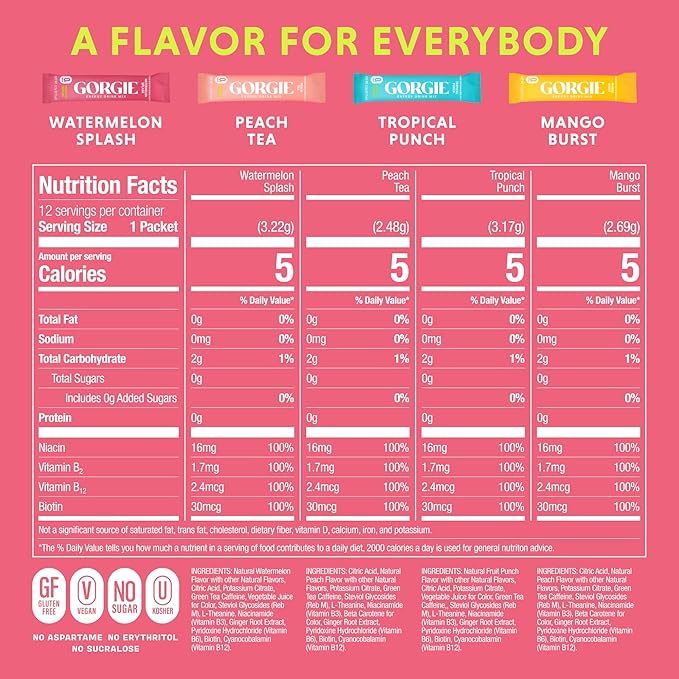 GORGIE Energy Drink Mix Bestsellers Variety Pack delivers a curated selection of the brand's most popular flavors in one convenient bundle. Each serving contains a balanced blend of caffeine and B-vitamins. The variety format lets you discover your preferred taste while maintaining consistent quality across every mix. Perfect for fitness enthusiasts, professionals, and anyone looking for a convenient energy drink mix.