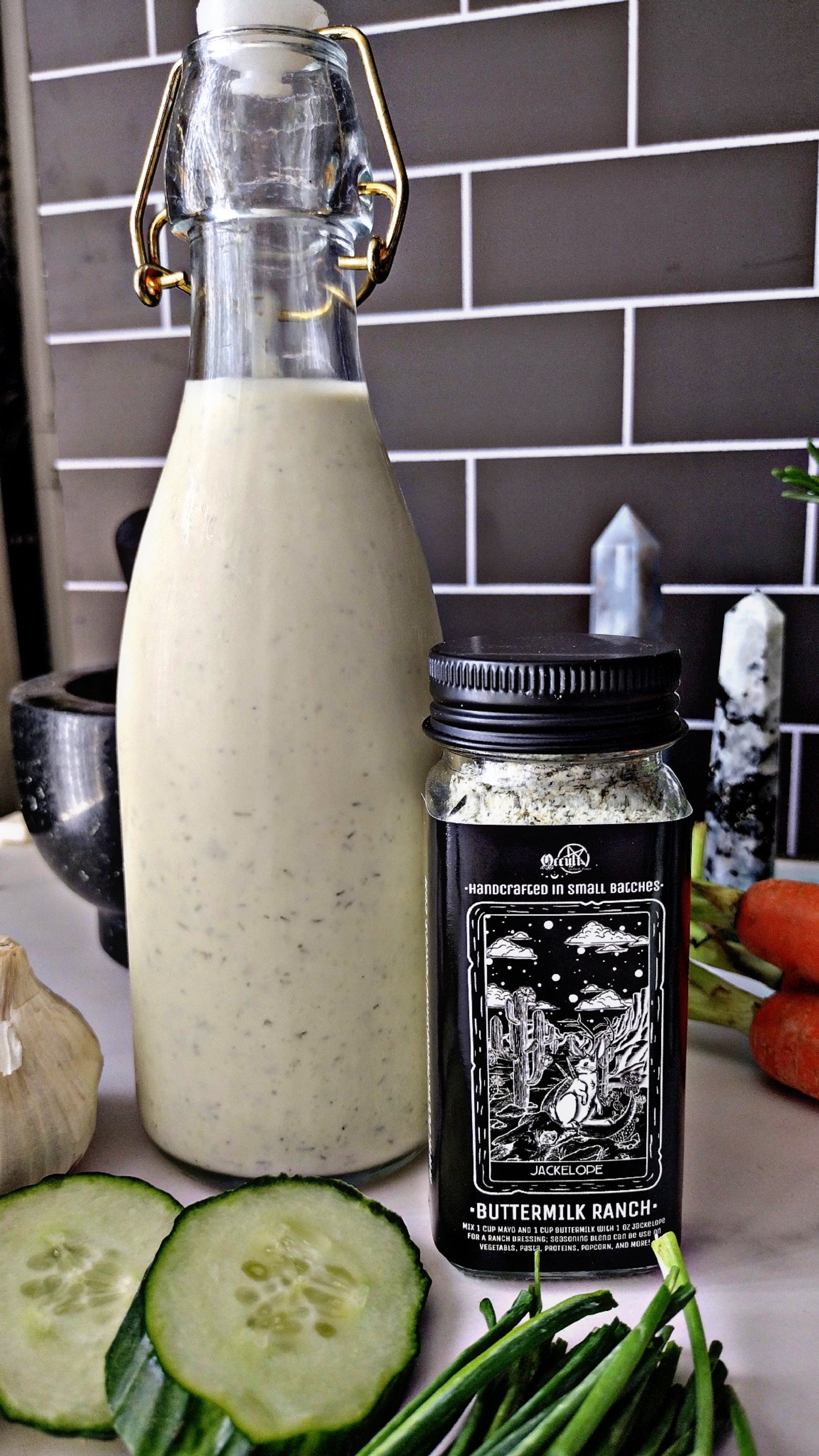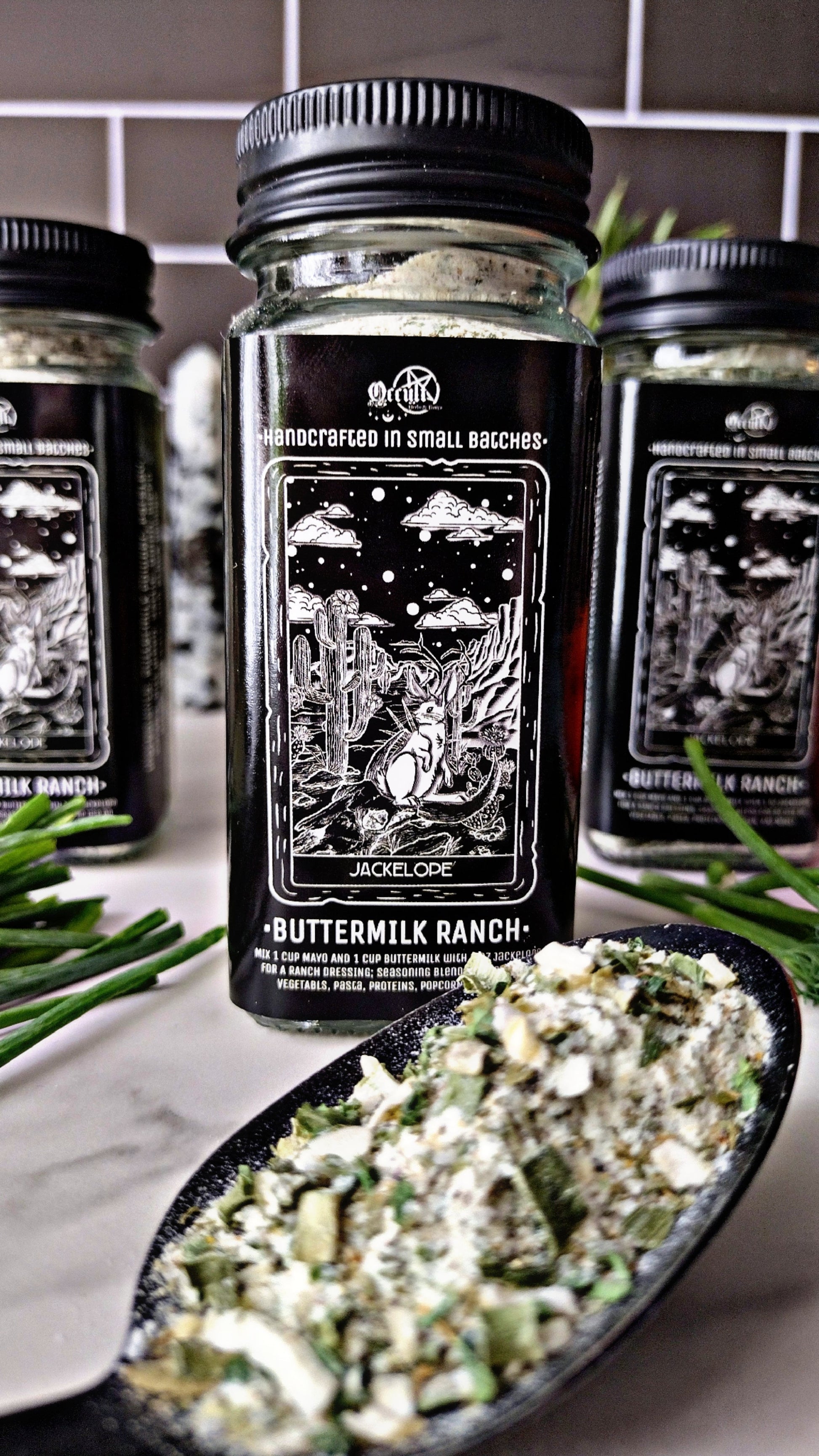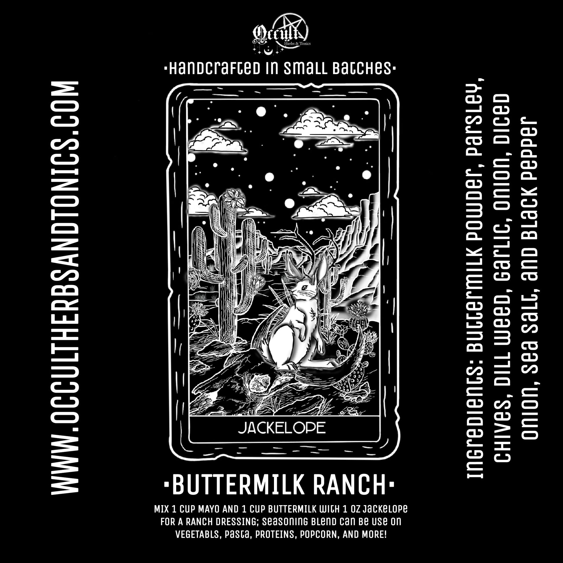 Jackelope Spice Blend: Unleash the mythical flavors of the Jackelope with this enchanting blend. Combining the creamy tang of buttermilk powder with the savory notes of garlic and onion, and a touch of fresh herbs like dill, parsley, and chives, this blend is perfect for adding a magical twist to your dishes. Sprinkle it on roasted vegetables, mix it into dips, or use it as a seasoning for chicken and fish to bring a taste of legend to your table. Can be used to craft a buttermilk ranch dressing! Use one cup mayo, one cup buttermilk and combine with one or two tablespoons (however much seasoning is preferred) and mix together to use on salads, proteins and more!