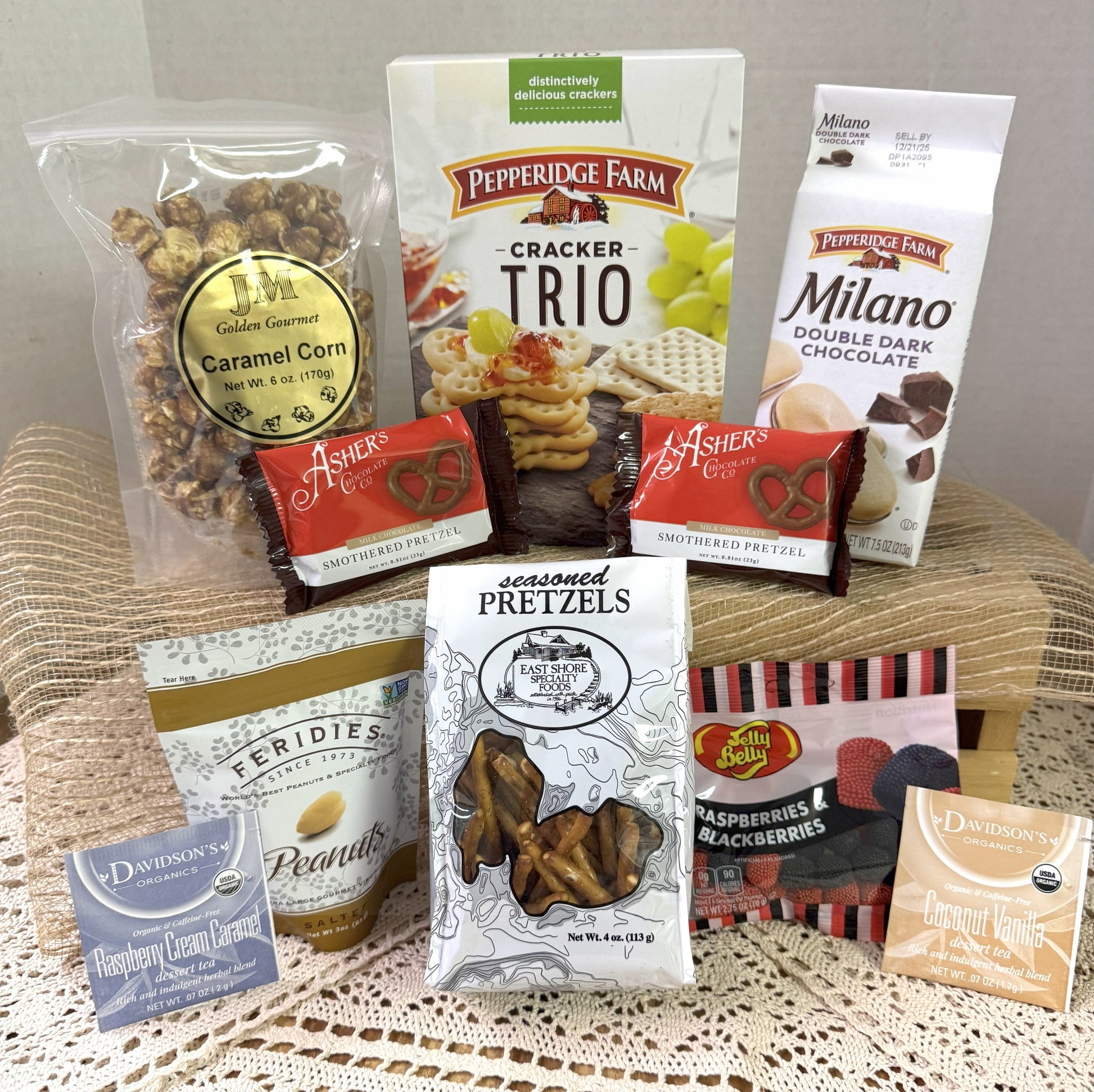 Experience spring with this premium metal basket featuring a convenient handle and a charming lavender color scheme. Choose from Lavender or Flowers In Bloom themes. Inside, you'll find a delightful assortment including Pepperidge Farm Crackers, Milanos Cookies, Feridies Peanuts, seasoned pretzels, caramel popcorn, two chocolate-covered pretzels or jelly beans, plus two tea packets—perfect for a refreshing and tasty gift.