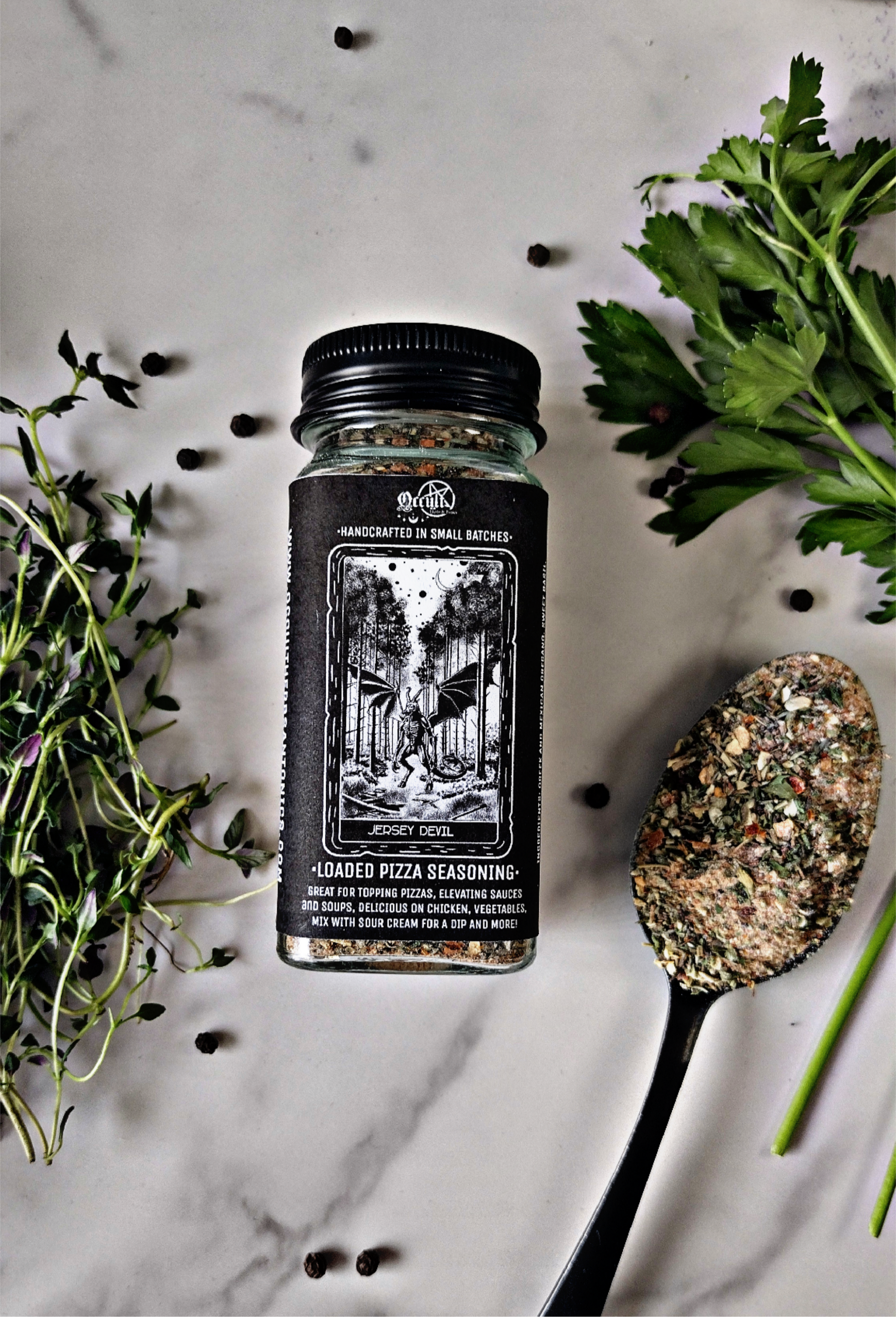 Crafted in small batches by Occult Herbs & Tonics, this loaded pizza seasoning is your new go-to for supernatural flavor without the high salt, added sugar, or preservatives. Whether you're topping pizzas, elevating soups and sauces, or stirring up an addictive chip dip, this blend is pure 🔥.