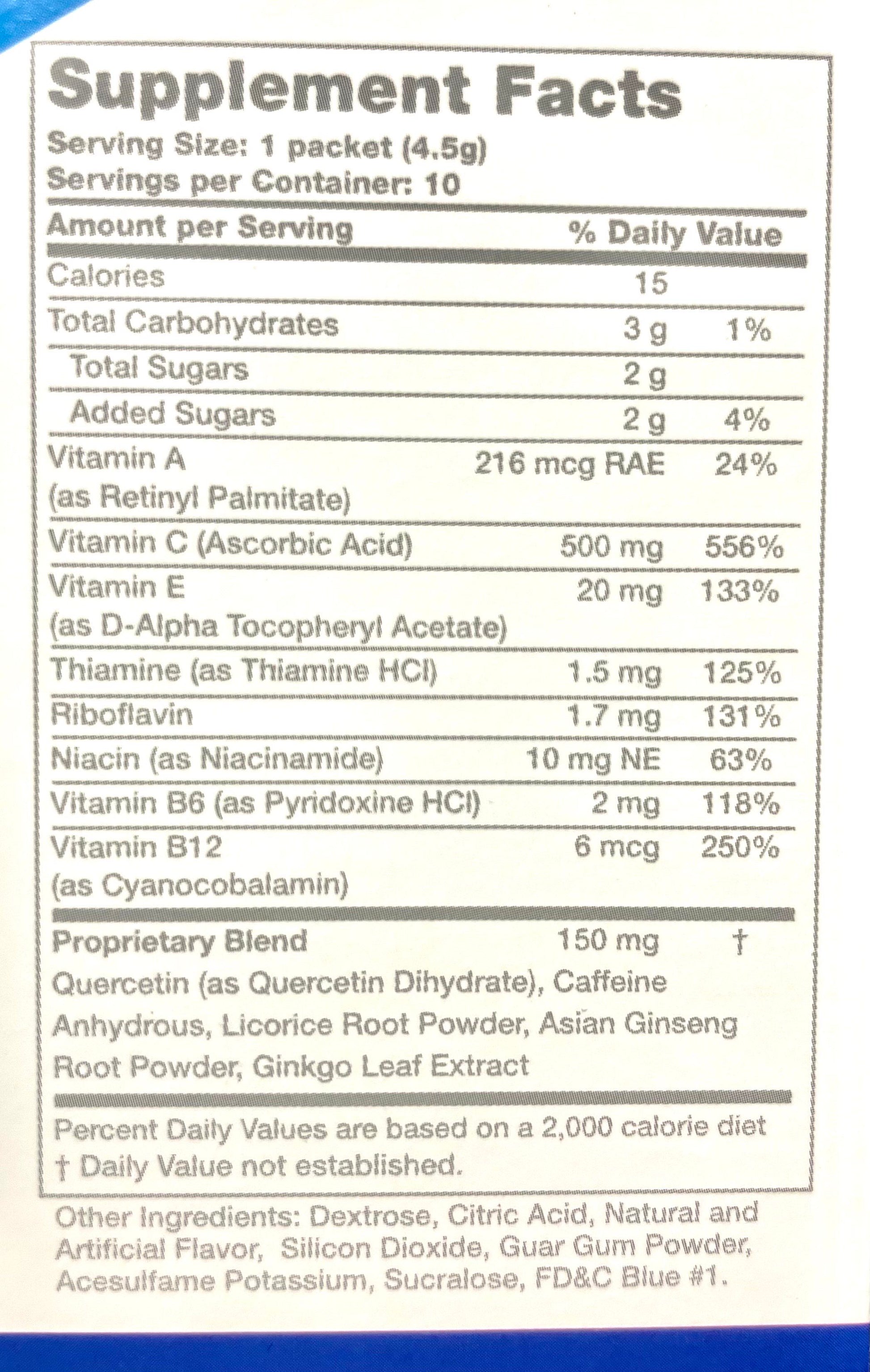 *Proprietary Blend 150mg: Quercetin (as Quercetin Dihydrate), Caffeine Anhydrous, Licorice Root Powder, Asian Ginseng Root Powder, Ginkgo Leaf Extract.