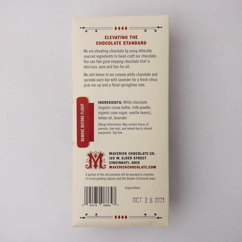 Ingredients: White chocolate (organic cocoa butter, milk powder, organic cane sugar, vanilla beans), lemon oil, lavender.