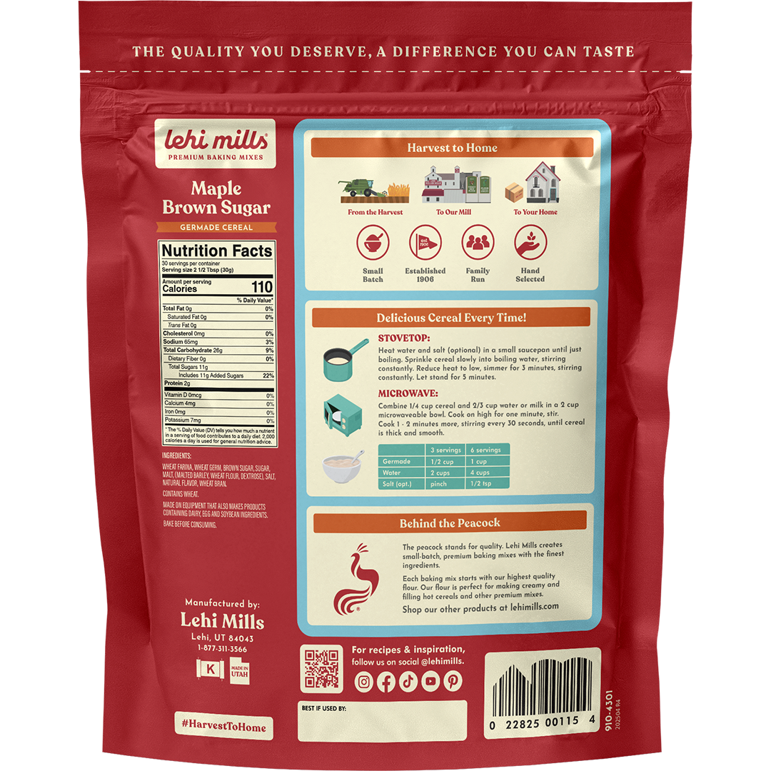 Lehi Mills Maple Brown Sugar Germade Cereal – a warm, comforting blend of rich maple flavor and sweet brown sugar in every creamy spoonful. Made from finely ground wheat, this premium hot cereal cooks up smooth and satisfying, delivering a nostalgic taste that feels like home.