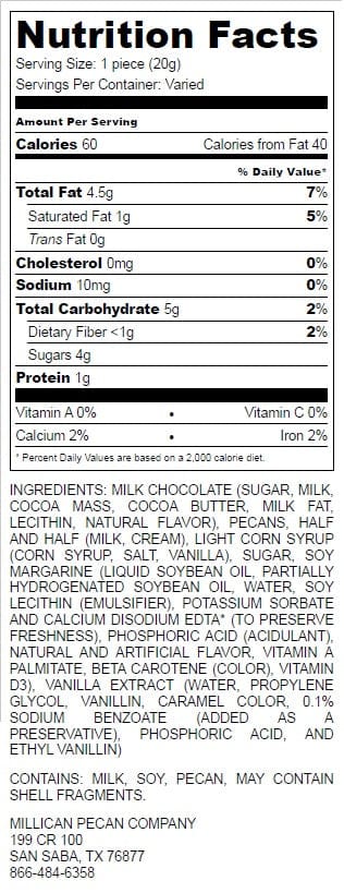 Ideal for personal indulgence or as thoughtful pecan gifts, these milk chocolate Caramillicans are beautifully packaged for any occasion. Visit our pecan store to order these irresistible pecan candy treats and share the joy of gourmet goodness!