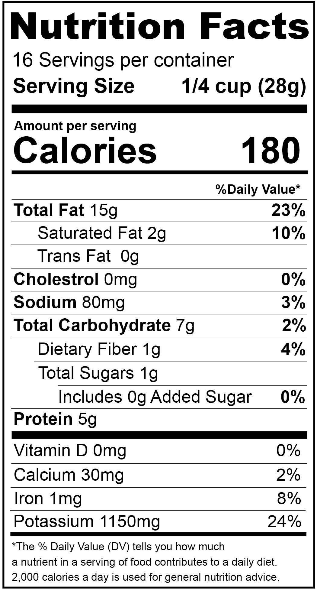 Allergen Statement: Product packed in a facility that also handles nuts, peanuts, soy, sesame, and wheat. 10 oz and 2 lb sizes only.
