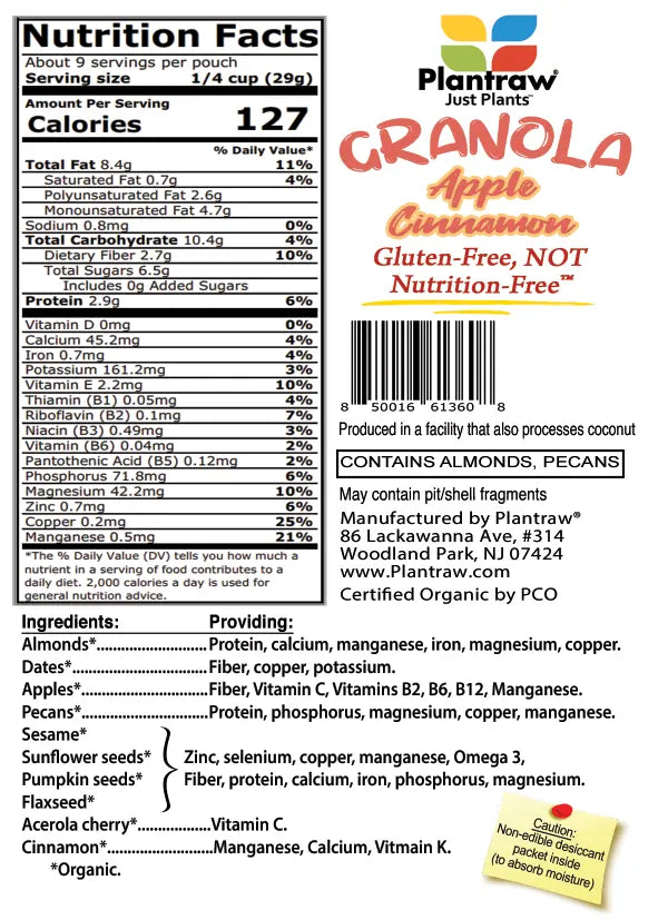 Ingredients: Almonds*, Dates*, Apples*, Pecans*, Sunflower seeds*, Pumpkin seeds*, Flaxseed*, Acerola cherry*, Cinnamon*.