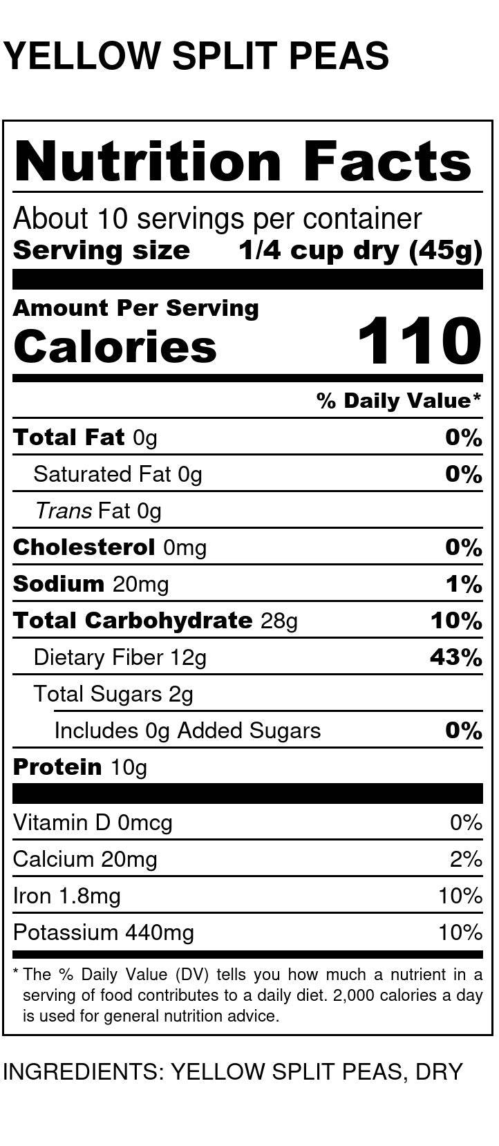Yellow split peas are also a good source of iron, potassium, folate, vitamin B1, and a number of other vitamins and minerals. They are a healthy choice because they are low in calories and fat.