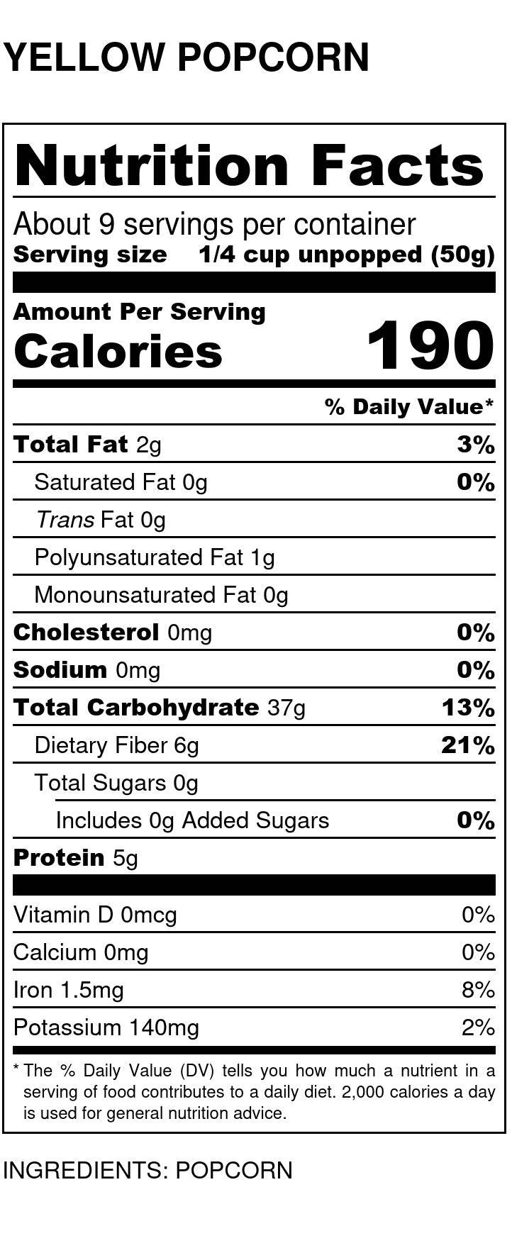 Yellow popcorn kernels are mostly carbs (who doesn't like carbs??) but contain a fair amount of protein, as well as some good fiber!