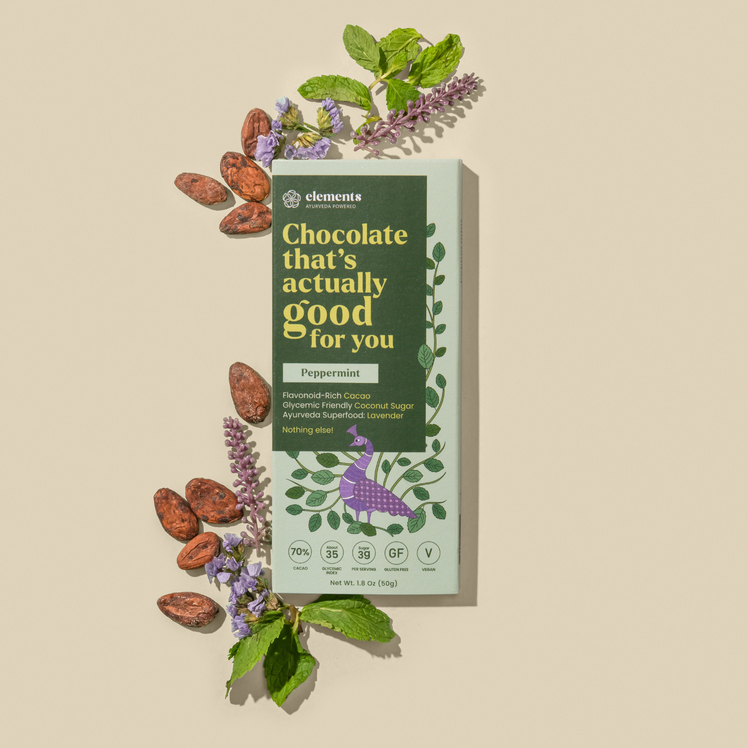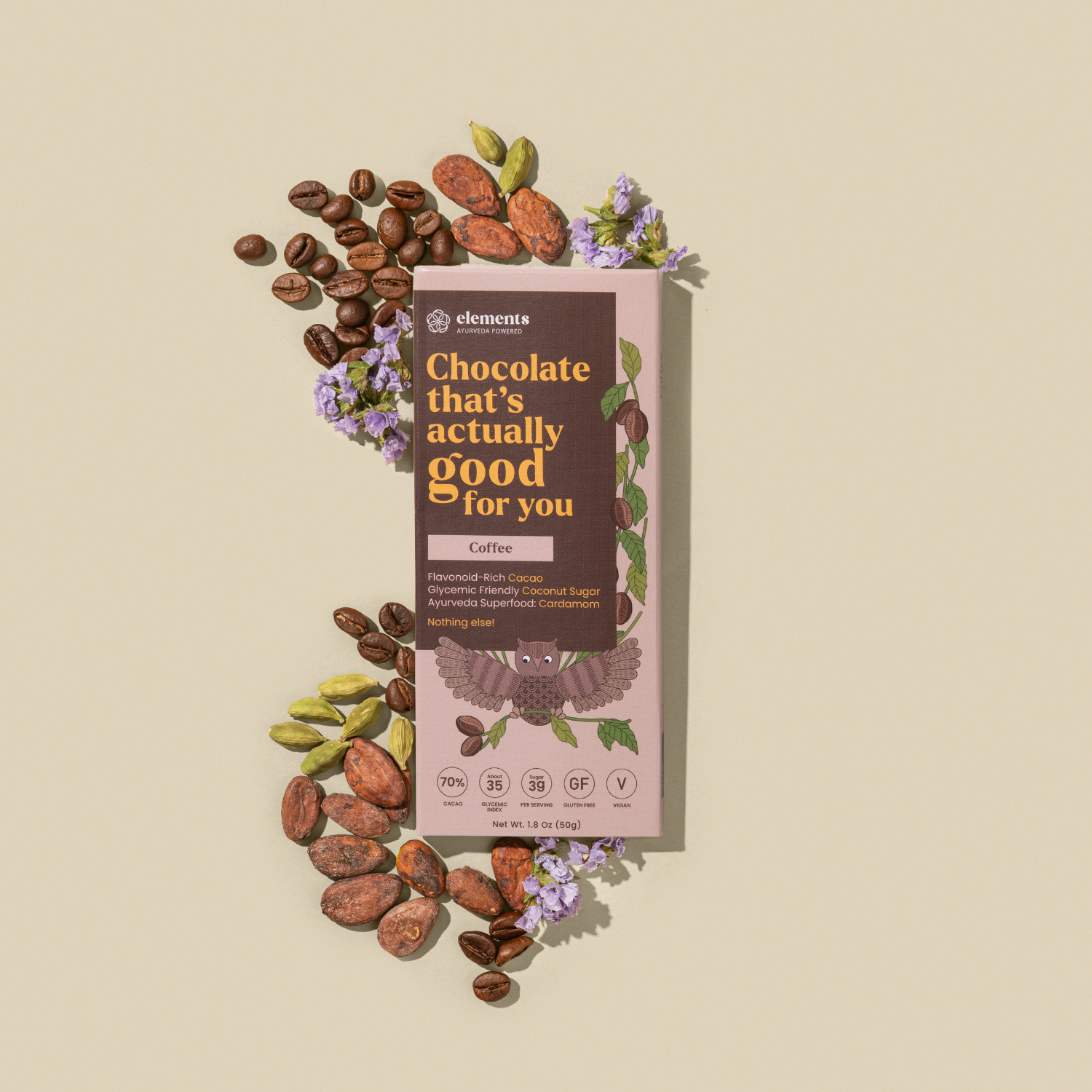 Ingredients: Organic Cacao, Organic Coconut Sugar, Organic Cacao Butter, Blend of Pure Essential Oils, Functional Superfoods