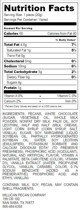 Indulge in our Delicious White Chocolate Caramel Pecan Nut Caramillicans, a delightful treat that will elevate your snacking experience! These gourmet pecan candies, similar to Turtles but even more delectable, feature a buttery caramel base blended with our premium pecans. Each piece is generously topped with creamy white chocolate, creating a perfect harmony of flavors and textures.