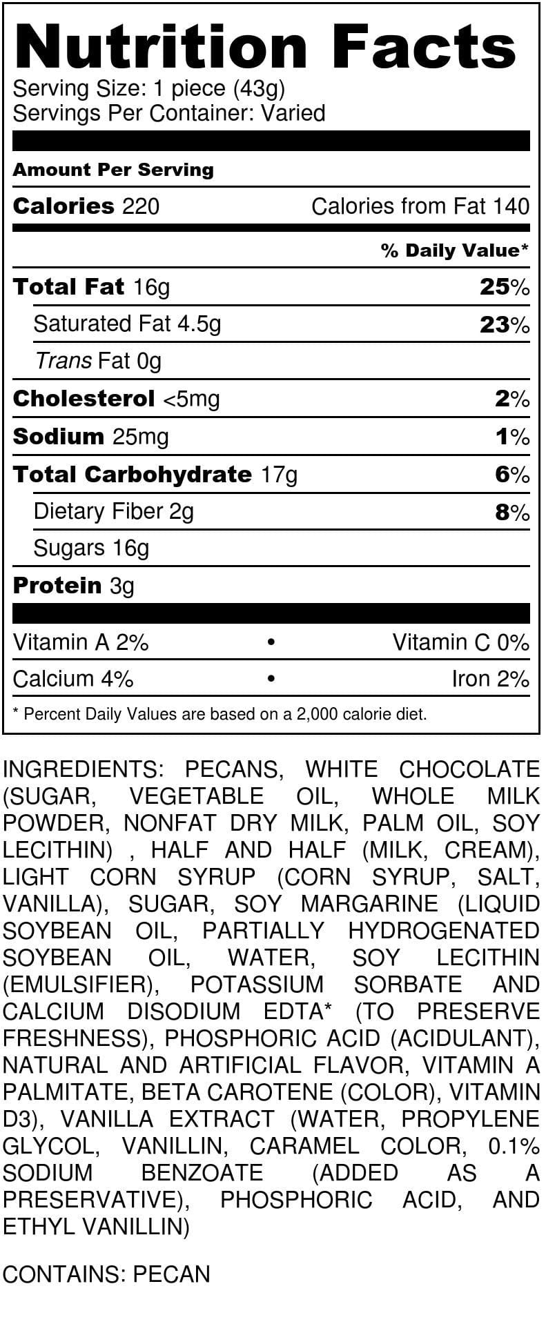 Packaged beautifully in a decorative gift box or available individually, these white chocolate pecan candies make fantastic pecan gifts for any occasion. Whether you're celebrating a special event or treating yourself, our handcrafted Caramillicans are sure to impress. Shop today at our orchard pecan country store and indulge in these irresistible pecan treats!